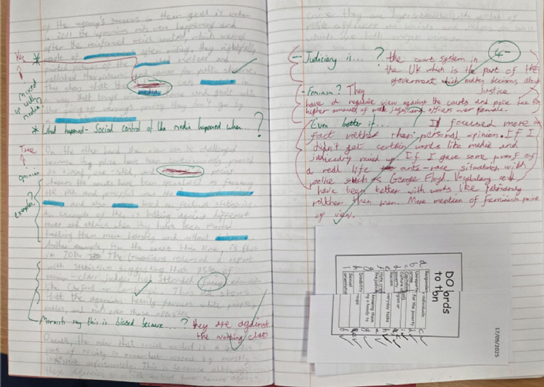 This is an example of how the teacher is giving live feedback when a student is preparing for an assessment. The key thing here is that the teacher is quickly checking where there are weaknesses in the plan, which allows the student to be more successful in the assessment. As you can see, it didn’t take long for the teacher to glance through and identify where improvements could be made quickly.