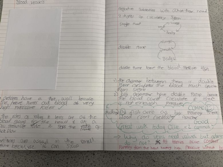 This teacher has marked a piece of work and given the student a question to answer, to get more information out of them. They answered the first question, but the teacher wasn’t quite happy, so they went back and asked another question to draw more information out of them.