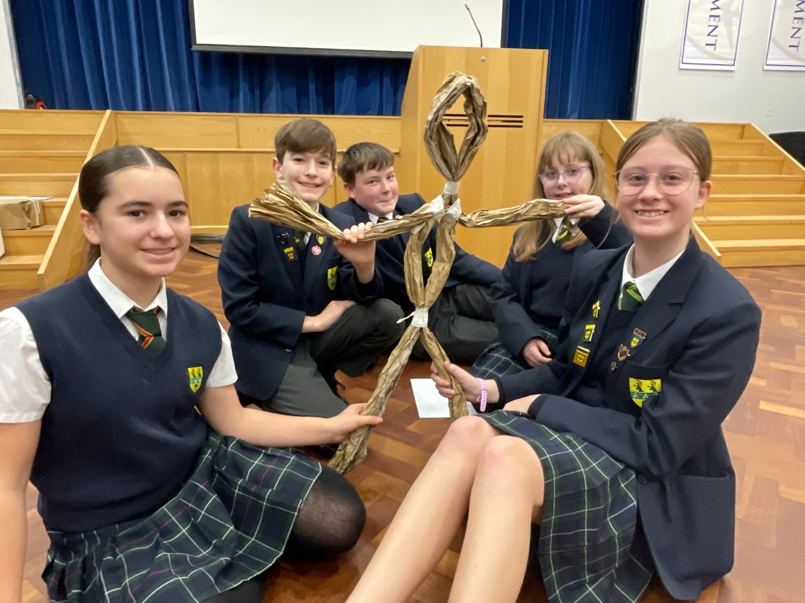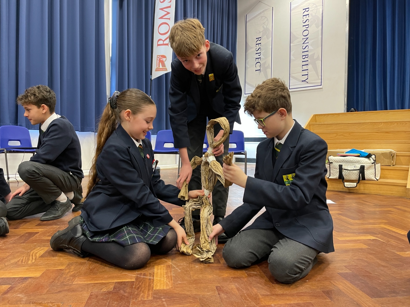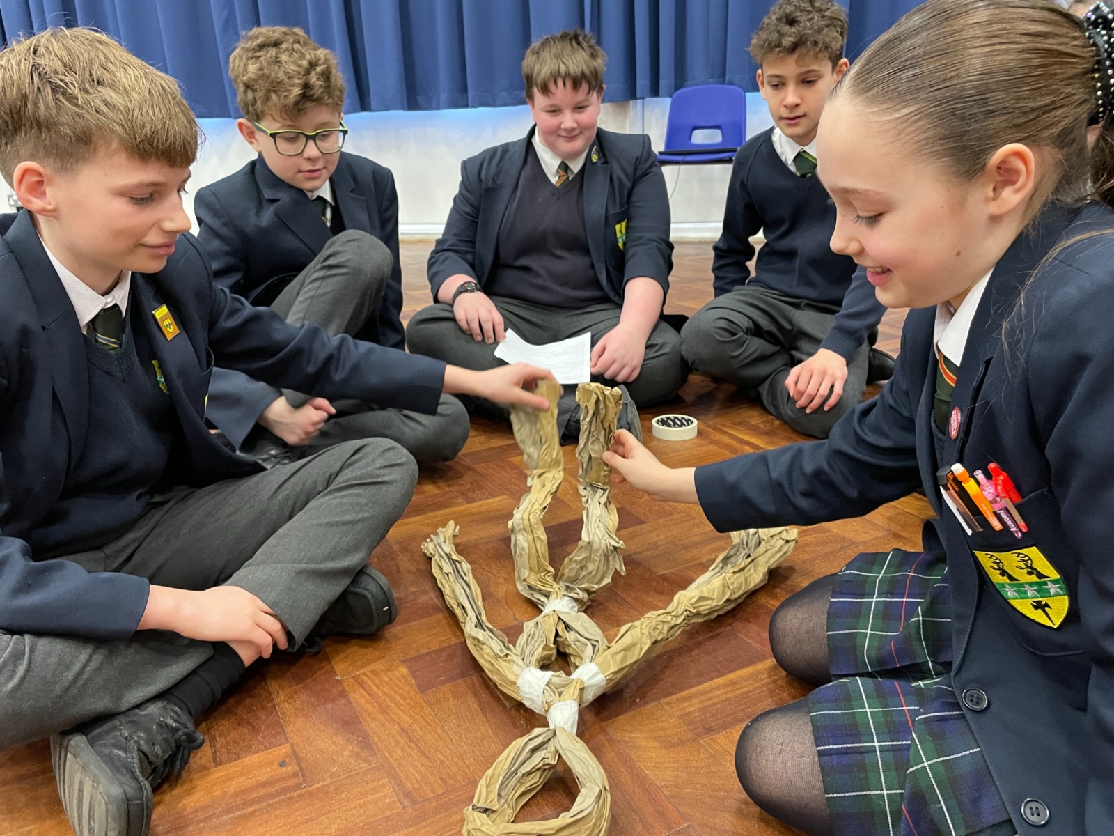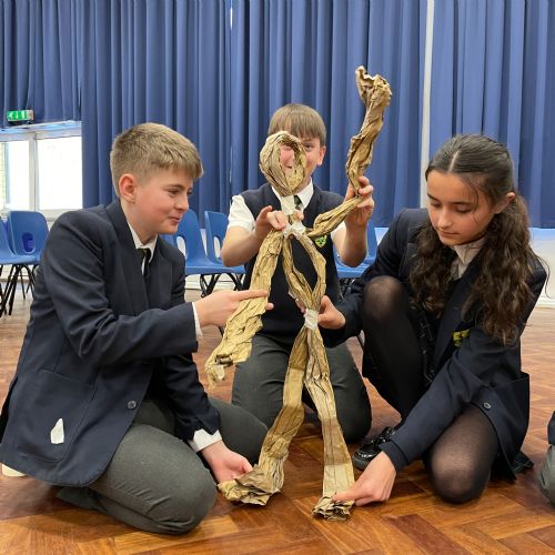 Working in groups, students constructed a puppet frame using only brown parcel paper and tape. By carefully folding the “bone structure,” they were able to create joints that allowed their puppets to move and articulate.