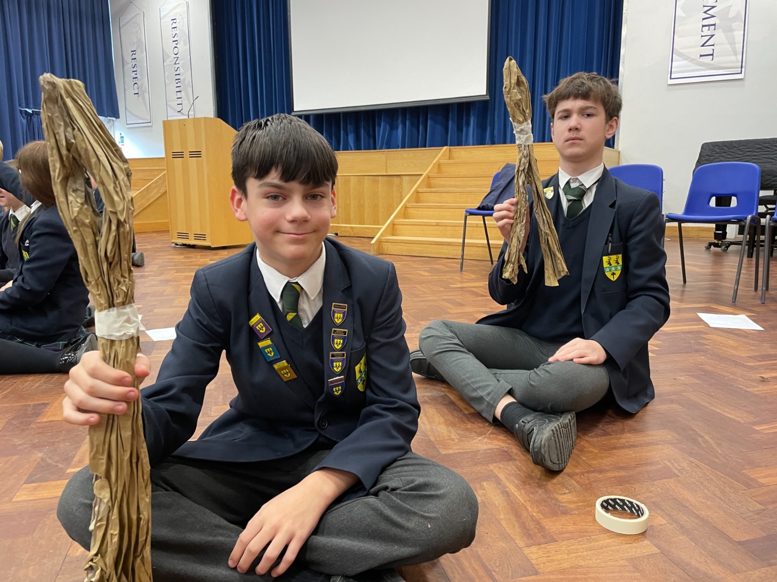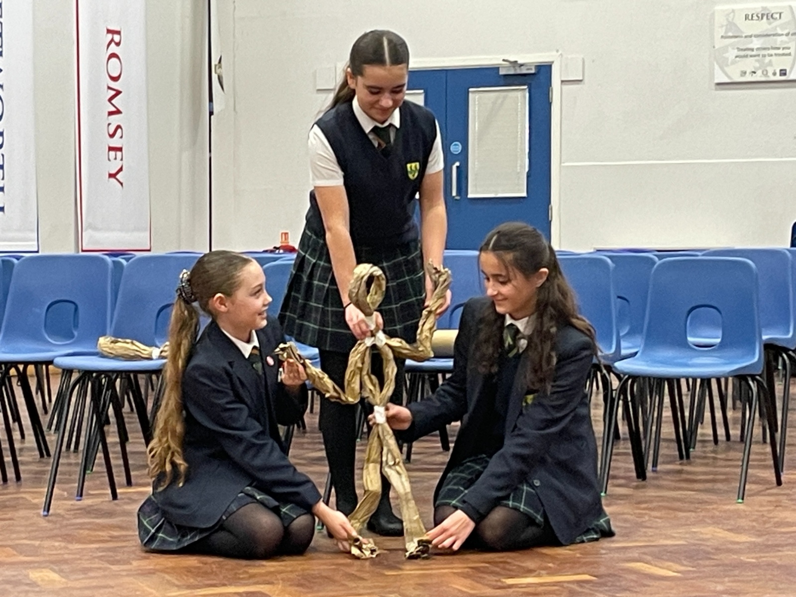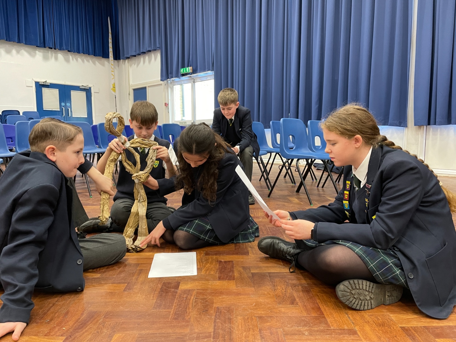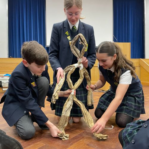 Working in groups, students constructed a puppet frame using only brown parcel paper and tape. By carefully folding the “bone structure,” they were able to create joints that allowed their puppets to move and articulate.